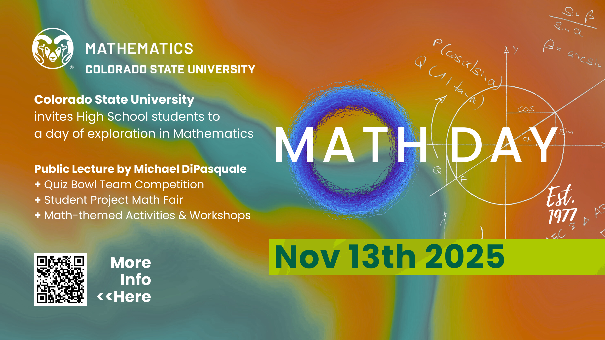 Below are resources for your school to use to get the word out to students and parents about Math Day 2025. Please reach out to Mathdayinfo@colostate.edu with your name and school’s mailing address for us to send you a Math Day poster.